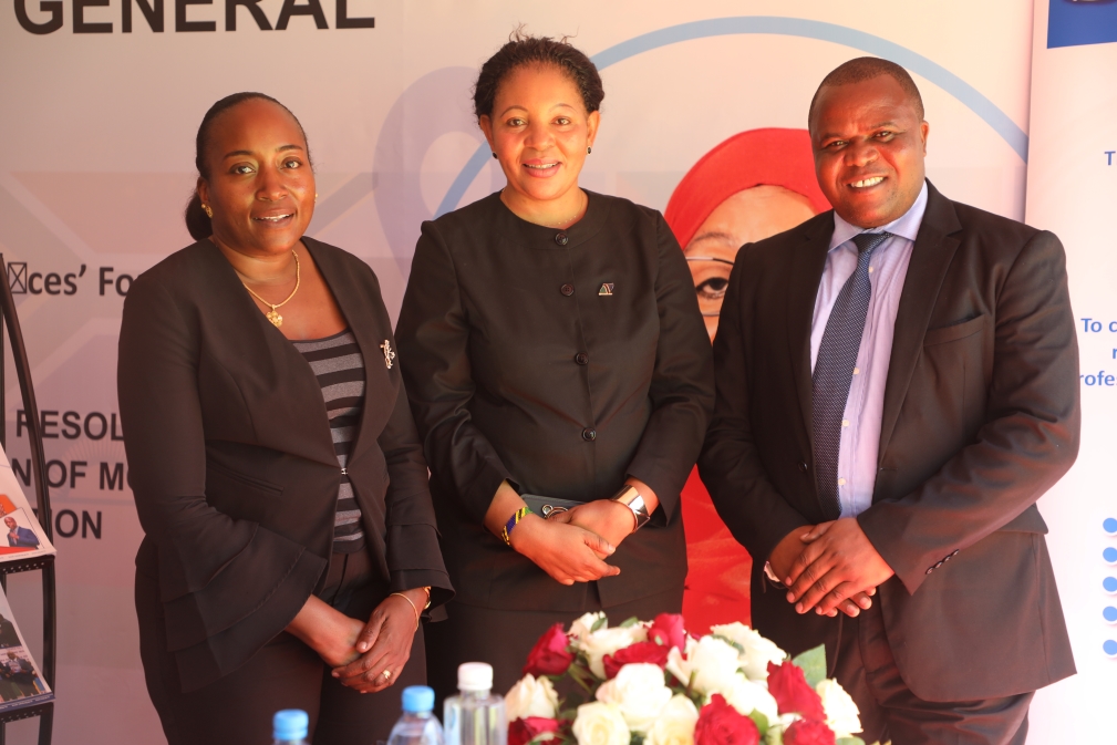 Mkurugenzi Msaidizi wa Mashauri ya Katiba, Haki za Binadamu na Uchaguzi wa Ofisi ya Wakili Mkuu wa Serikali, Hangi Changá (kulia) na Alicia Mbuya, (katikati) akiwa na Mercy Kyamba, Mkurugenzi Msaidizi Udhibiti Ubora.